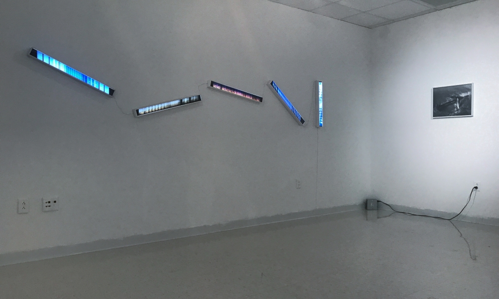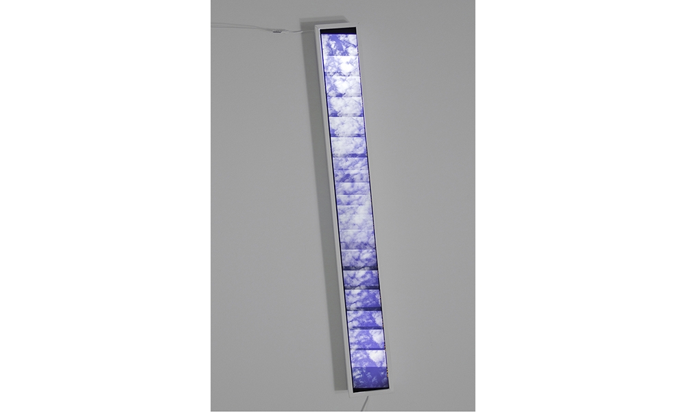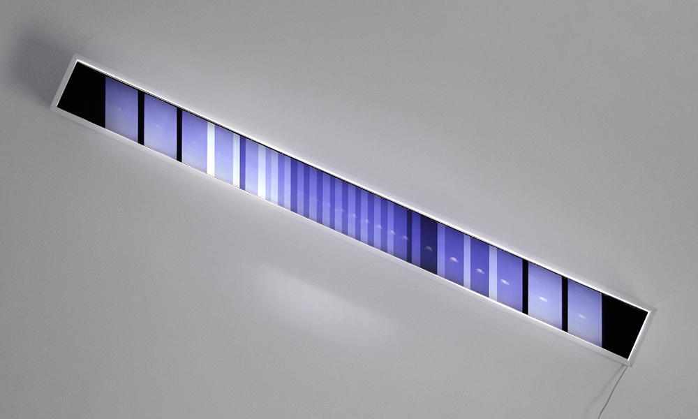 5 120mm color transparency films displayed in custom light boxes, framed inkjet print with graphite-on-mylar overlay