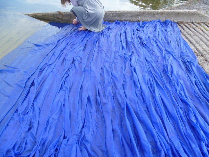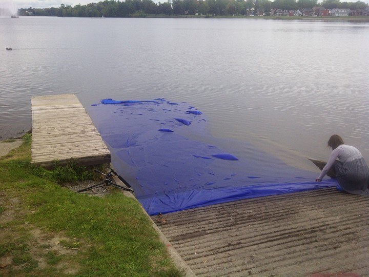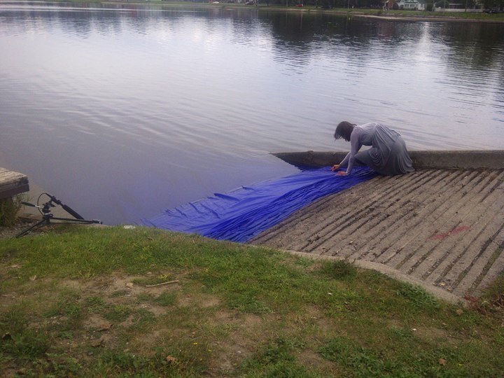 Taffeta floats on and in the lake, while the microphone amplifies the small sounds of tiny waves gently lapping.